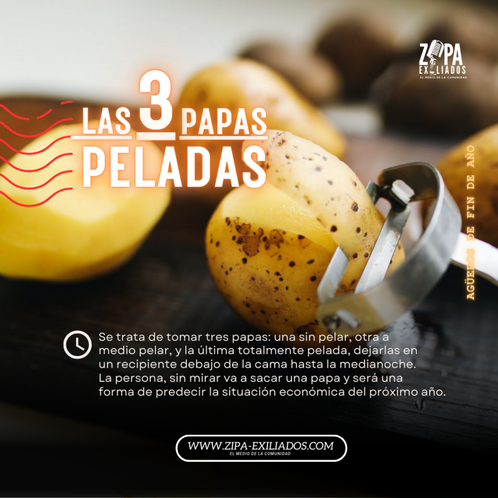 Se trata de tomar tres papas: una sin pelar, otra a medio pelar, y la última totalmente pelada. Luego, dejarlas en un recipiente debajo de la cama hasta la medianoche. La persona, sin mirar va a sacar una papa y será una forma de predecir la situación económica del próximo año.