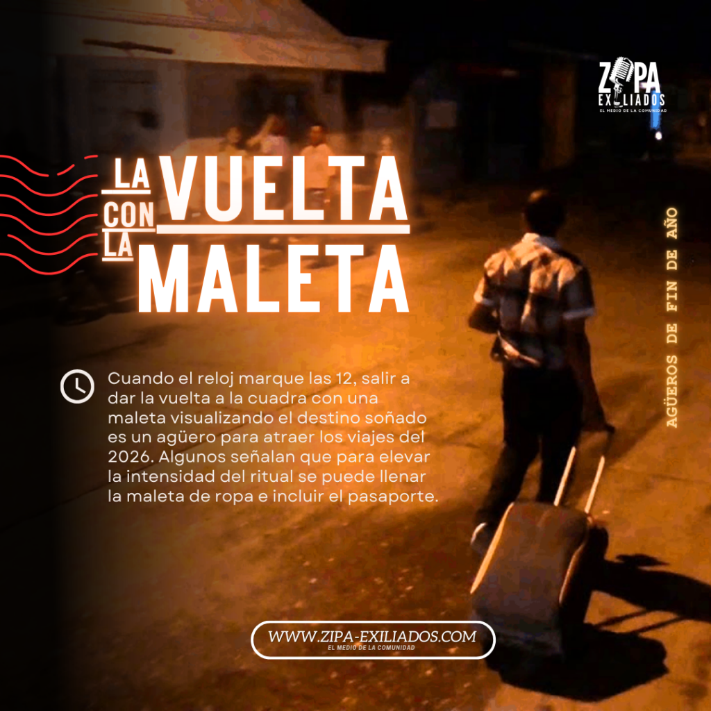 Cuando el reloj marque las 12, salir a dar la vuelta a la cuadra con una maleta visualizando el destino soñado es un agüero para atraer los viajes del 2026. Algunos señalan que para elevar la intensidad del ritual se puede llenar la maleta de ropa e incluir el pasaporte.