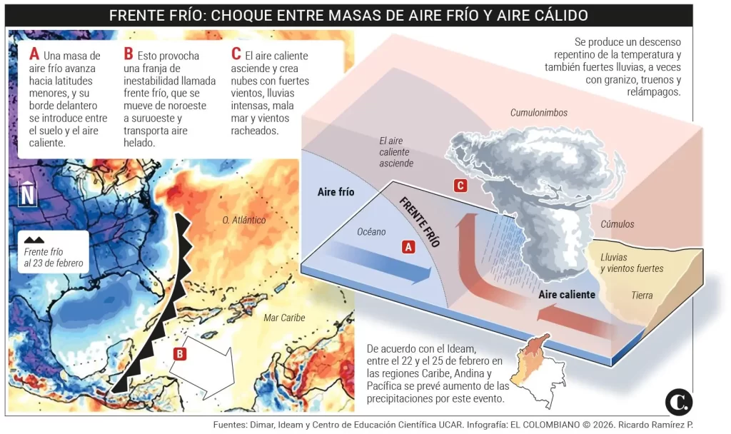 El Instituto de Hidrología, Metereología y Estudios ambientales (IDEAM) advierte sobre un incremento significativo de las precipitaciones, vientos y oleaje entre el 23 y el 27 de febrero debido a la interacción de un frente frío con la vaguada monzónica, afectando especialmente a las regiones Caribe, Andina y Pacífica.