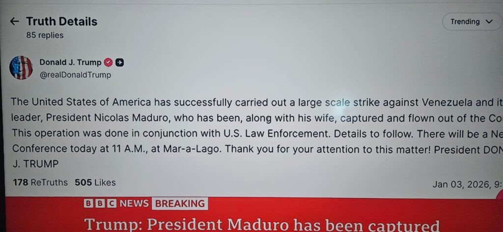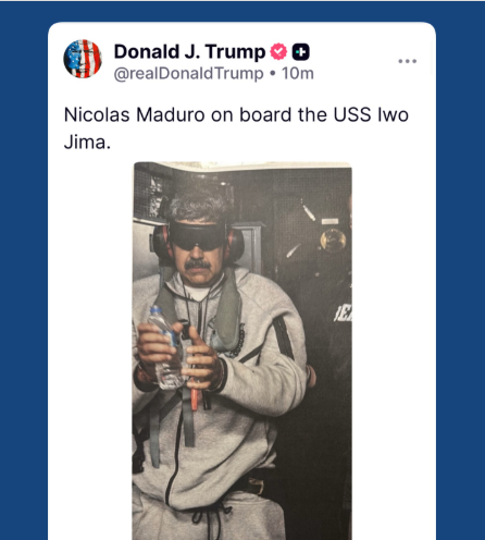 Donald Trump difunde en la red social Truth Social la primera foto oficial de la captura de Nicolás Maduro.