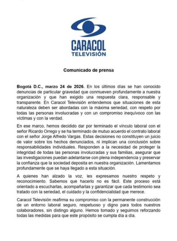 En un comunicado de prensa emitido durante la tarde de este martes 24 de marzo, la cadena Caracol Televisión informó a la opinión pública su decisión de desvincular a dos de sus figuras más reconocidas: los periodistas Ricardo Orrego y Jorge Alfredo Vargas a raiz de las denuncias de varias periodistas por presunto acoso sexual.