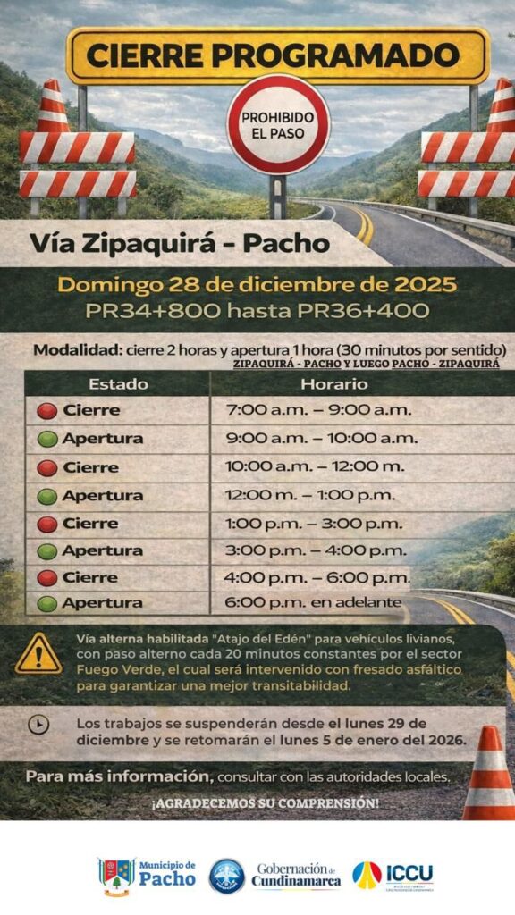 La vía Zipaquirá – Pacho (PR34+800 a PR36+400) tendrá cierres programados el domingo 28 de diciembre de 2025, con el siguiente horario: