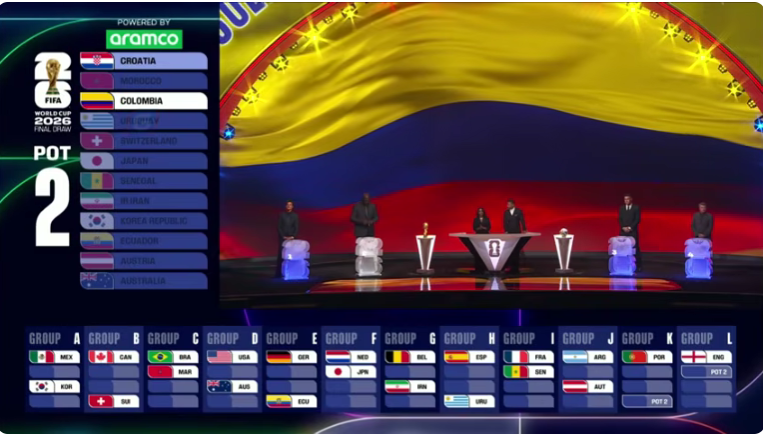 La Selección Colombia quedó en el bombo 2 y en el sorteo le corresponderá jugar en el Grupo K, grupo encabezado por Portugal y quien será rival en la primera etapa del certamen deportivo, en el mes de junio de 2026. Las otras dos selecciones que conforman el grupo son Uzbekistán, equipo que por primera vez clasifica a un mundial y finalmente la selección ganadora entre el repechaje disputado por Nueva Caledonia, República Democrática del Congo y Jamaica.