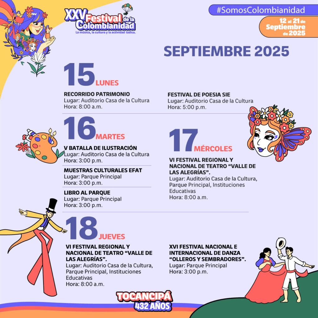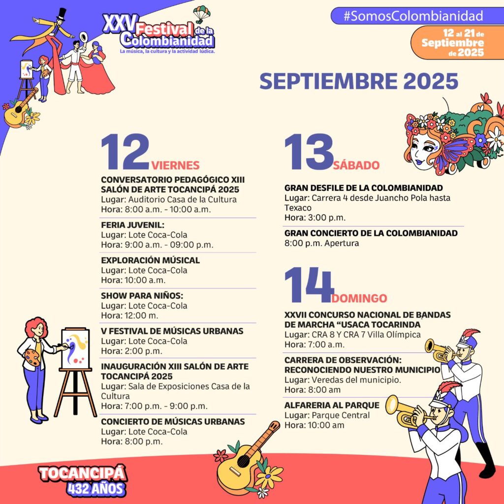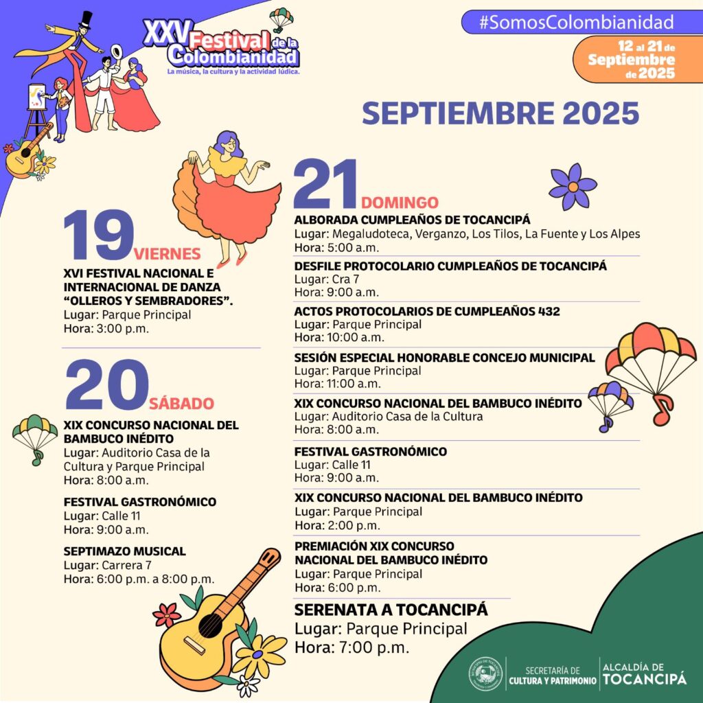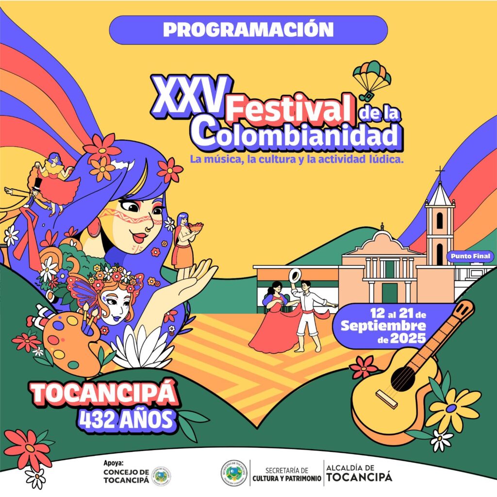 A partir del 12 y hasta el próximo 21 de septiembre, el vecino municipio de Tocancipá se viste de fiesta. En el marco del cumpleaños número 432 de fundación, en ese municipio se desarrollará la vigésimo quinta versión del Festival de la Colombianidad: la música, la cultura y la actividad lúdica.