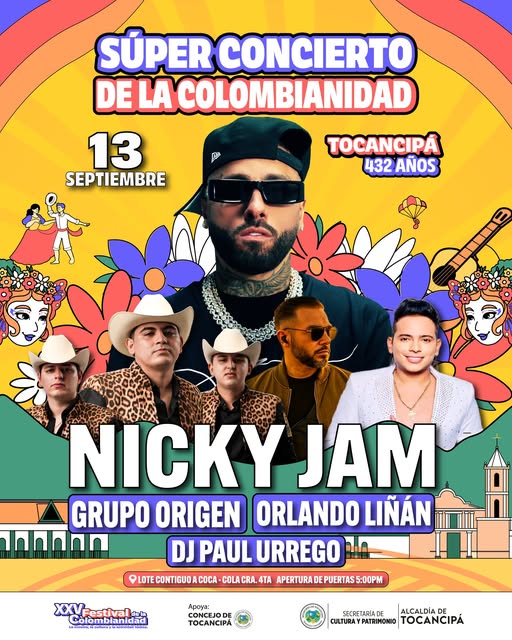 De igual manera, la presentación artística más esperada se dará en el anual “Gran Concierto de la Colombianidad” que se llevará a cabo el sábado 13 de septiembre y cuyo artista principal es Nicky Jam. En el mismo escenario estarán Grupo Origen, Orlando Liñan y DJ Paul Urrego, quienes amenizarán la noche de los tocancipeños y de los turistas que visitarán el municipio por motivo del cada vez más importante festival de la región a nivel cultural.