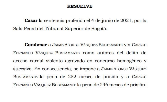 En la parte resolutiva del fallo, el tribunal fue enfático al negar cualquier tipo de beneficio, subrogado penal o mecanismo sustitutivo de cumplimiento de la pena, ordenando de manera inmediata la expedición de las órdenes de captura contra los hermanos Vásquez Bustamante. “La Sala resuelve casar la sentencia impugnada y, en su lugar, condenar a Jaime Alonso Vásquez Bustamante y a Carlos Fernando Vásquez Bustamante como autores del delito de acceso carnal violento agravado”, señala la providencia judicial que cierra este ciclo de litigio. La Corte recordó que, aunque contra esta decisión procede el mecanismo de impugnación especial, el cumplimiento de la sanción privativa de la libertad debe hacerse efectivo tras años de una batalla jurídica liderada por la representación de las víctimas para obtener justicia.