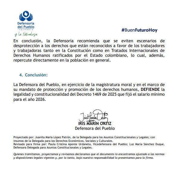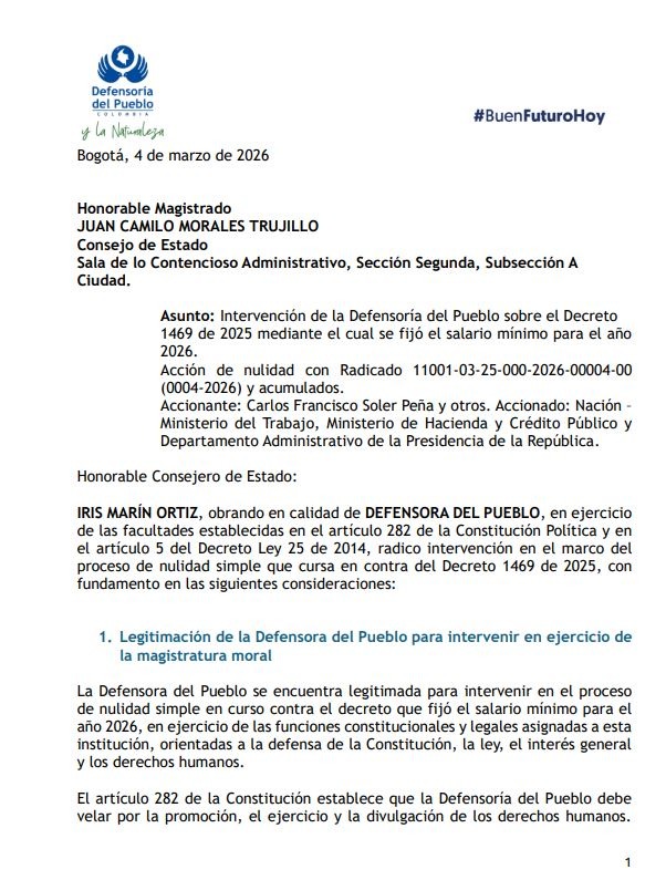 Con este respaldo jurídico, la Defensora del Pueblo hace un llamado al Consejo de Estado para que prevalezca el interés general y se proteja la base económica de la clase trabajadora colombiana. La decisión final queda ahora en manos del alto tribunal, que deberá ponderar los argumentos técnicos de los accionantes frente a la postura de la Defensoría, la cual insiste en que proteger el salario mínimo de 2026.