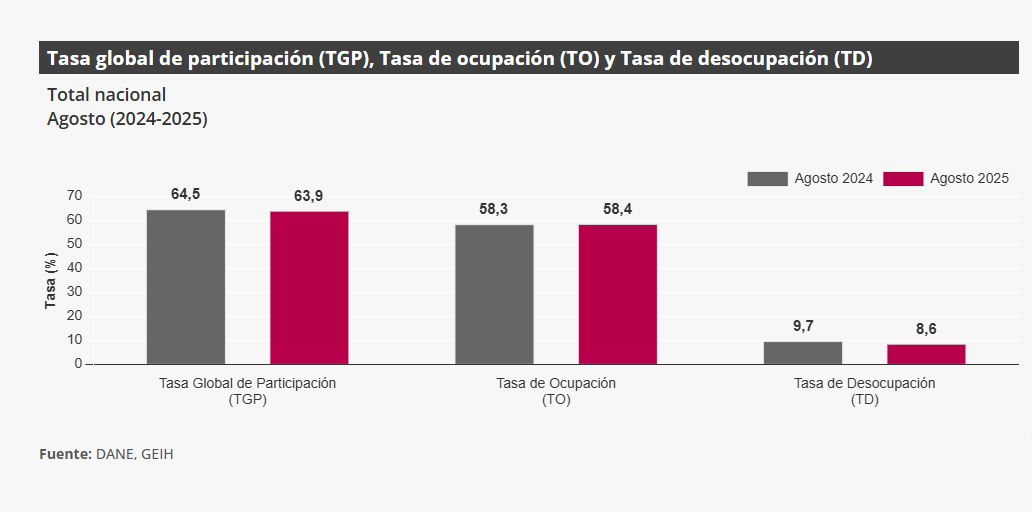 El Departamento Administrativo Nacional de Estadística (DANE) informó que la tasa de desempleo en Colombia cayó al 8,6% en agosto de 2025, cifra que representa una disminución de 1,1 puntos porcentuales frente al mismo mes del año anterior y que se constituye en la más baja de toda la serie histórica.