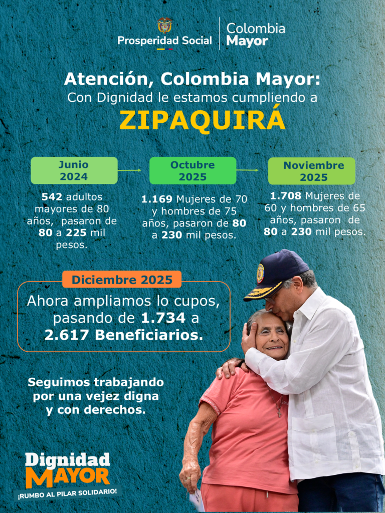 El programa Colombia Mayor hace parte del modelo de protección para la vejez y específicamente en Zipaquirá, la cobertura se ha incrementado significativamente. Según cifras de Prosperidad Social, en junio de 2024 habían 542 adultos mayores de 80 años inscritos que pasaron de recibir 80 mil pesos a 225 mil y para noviembre de este año ya habían 1.708 mujeres de 60 años y hombres de 65 años en adelante que pasaron de recibir 80 mil a 230 mil pesos. Ahora, asegura la entidad, “en diciembre de 2025 ampliamos los cupos, pasando de 1.734 a 2.617 beneficiarios”, se lee en la pieza informativa.