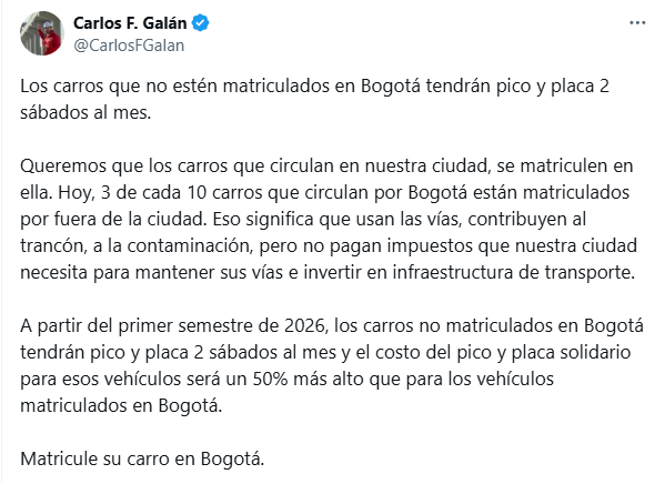 Para el burgomaestre de la capital, la medida es una invitación a que los carros que transitan en la ciudad sean matriculados en Bogotá. “A partir del primer semestre de 2026, los carros no matriculados en Bogotá tendrán pico y placa 2 sábados al mes y el costo del pico y placa solidario para esos vehículos será un 50% más alto que para los vehículos matriculados en Bogotá. Matricule su carro en Bogotá”, finaliza el trino.