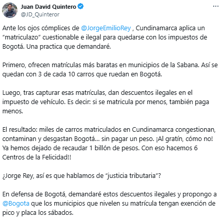 “Luego, tras capturar esas matrículas, dan descuentos ilegales en el impuesto de vehículo. Es decir: si se matricula por menos, también paga menos. El resultado: miles de carros matriculados en Cundinamarca congestionan, contaminan y desgastan Bogotá… sin pagar un peso. ¡Al gratín, cómo no! Ya hemos dejado de recaudar 1 billón de pesos. Con eso hacemos 6 Centros de la Felicidad!! ¿Jorge Rey, así es que hablamos de “justicia tributaria”? En defensa de Bogotá, demandaré estos descuentos ilegales y propongo a @Bogota que los municipios que nivelen su matrícula tengan exención de pico y placa los sábados”, concluyó.