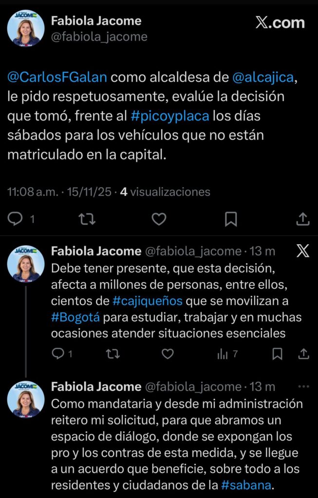 Por su parte, la alcaldesa de Cajicá, Fabiola Jácome también dio a conocer su postura. “Señor alcalde de Bogotá, Carlos Fernando Galán, como alcaldesa de Cajicá, le pido respetuosamente, evalúe la decisión que tomó, frente al pico y placa los días sábados para los vehículos que no están matriculados en la capital. Debe tener presente, que esta decisión, afecta a millones de personas, entre ellos, cientos de cajiqueños que se movilizan a Bogotá para estudiar, trabajar y en muchas ocasiones atender situaciones esenciales. Como mandataria y desde mi administración reitero mi solicitud, para que abramos un espacio de diálogo, donde se expongan los pro y los contras de esta medida, y se llegue a un acuerdo que beneficie, sobre todo a los residentes y ciudadanos de la sabana”, escribió en sus redes sociales.