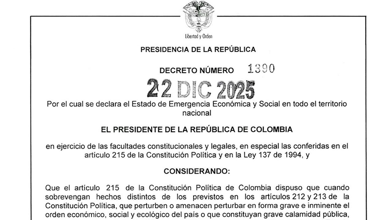 Mediante el Decreto 1390 del 22 de diciembre de 2025, el Gobierno del presidente Gustavo Petro declaró el Estado de Emergencia Económica y Social en todo el territorio nacional, una medida con la que el Ejecutivo busca recaudar $16,3 billones para enfrentar el déficit fiscal generado tras el hundimiento de la Ley de Financiamiento en el Congreso de la República.