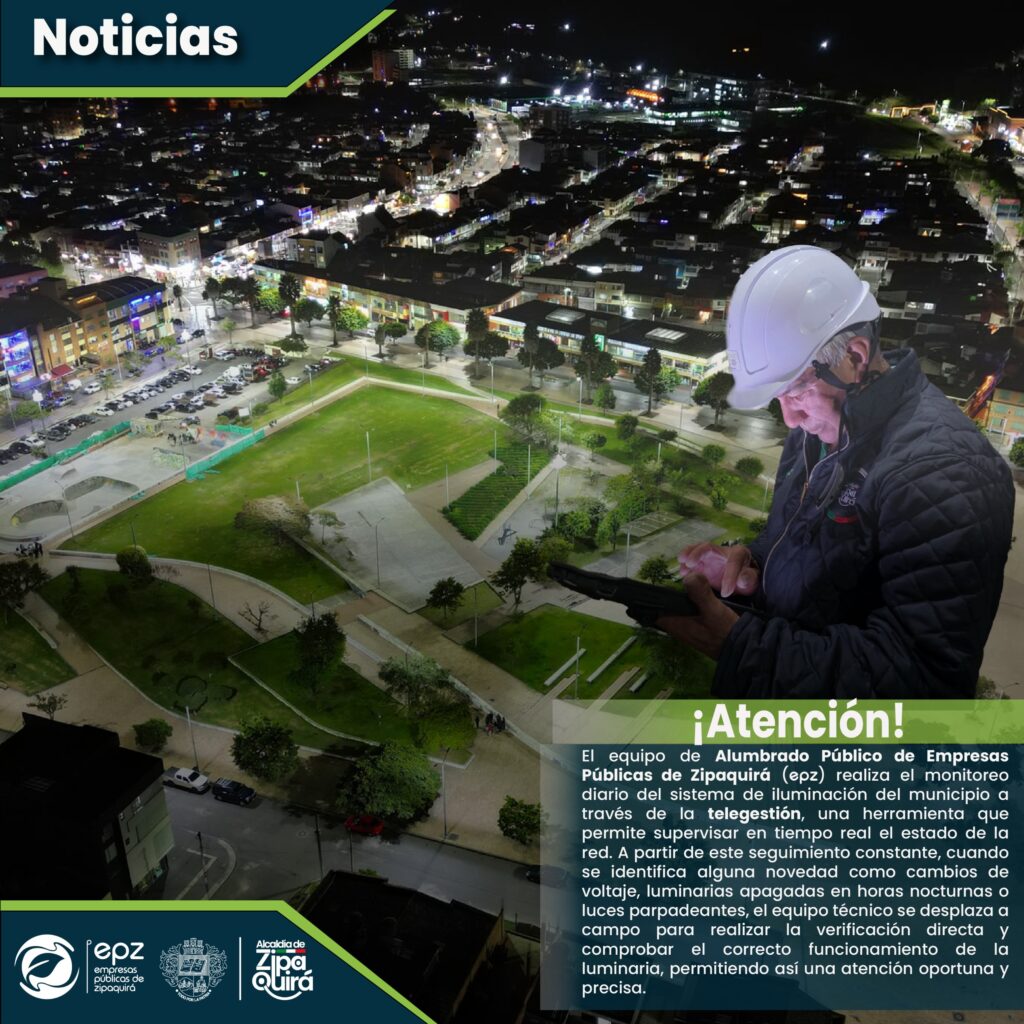 El equipo de alumbrado público de Empresas Públicas de Zipaquirá /EPZ) realiza el monitoreo diario del sistema de iluminación del municipio a través de la telegestión, una herramienta que permite supervisar en tiempo real el estado de la red. A partir de este seguimiento constante, cuando se intensifica alguna novedad como cambios de voltaje, luminarias apagadas en horas nocturnas o luces parpadeantes, el equipo técnico se desplaza a campo para realizar la verificación directa y comprobar el correcto funcionamiento de la luminaria, permitiendo así una atención oportuna y precisa.