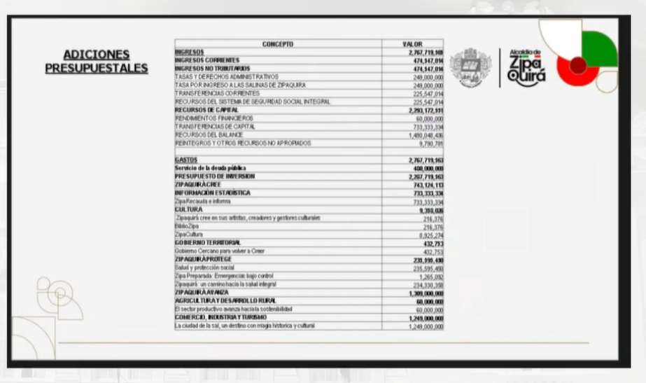 Los rubros de adición corresponden a valores de ingresos corrientes por un valor de $474.547.014 por concepto de tasa por ingreso a las salinas de Zipaquirá, transferencias corrientes y recursos del sistema de seguridad social integral; y, $2.293.172.551 por concepto de recursos de capital: rendimientos financieros, transferencias de capital, recursos del balance y reintegros y otros recursos no apropiados para un total de $2.767.719.565.