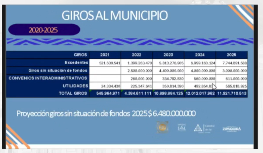 En la sesión de ilustración, Páez señaló que “surge la necesidad de pedir la modificación con unos recursos que estaban comprometidos, desde la Catedral de Sal. Para contextualizar un poco, vamos a hablar sobre los recursos que están comprometidos. Esta diapositiva ilustra lo que hemos girado de excedentes en esta vigencia”: