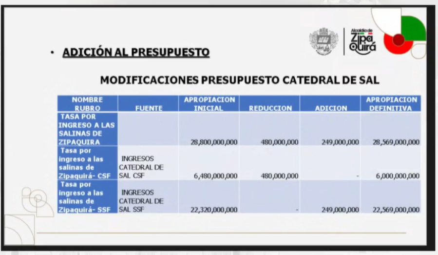 Durante la exposición, Chaves señaló que la adición de $1.480 millones al presupuesto provienen de los excedentes de Catedral de Sal. Según la funcionaria, al cierre del 2024 Catedral de Sal tuvo un poco más de $8.410 millones en excedentes. De los cuales, el Concejo Municipal ya ha aprobado la adición de recursos por cerca de $6.410 millones a través de los Acuerdos 01, 05, 06 y 09 de 2025.