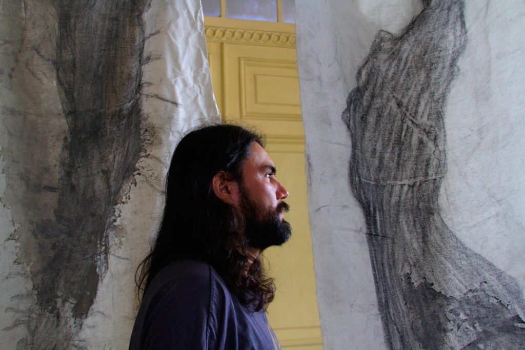 Por su parte, Andrés Quintero, compartió su experiencia en la residencia artística “Raro, Buenos Aires”, donde concibió una obra que reflexiona sobre la relación de esa ciudad con su río. Su pieza, una tela extendida, documenta el desplazamiento de un bloque de cemento por las calles de la capital argentina, simbolizando la constante lucha por ganar terreno al río, un reflejo de una ciudad que, según el artista, se ha construido “dándole la espalda” a su entorno natural. “Una de las cosas que me impactó cuando viajé a Buenos Aires, era el cemento y como la materialidad de la ciudad. Una ciudad que casi no tiene huella de territorio, como que se construyó del siglo xx hacia adelante y hacia atrás como que no nos da indicios de lo que había antes de la ciudad”, explica Quintero sobre el origen de su obra.