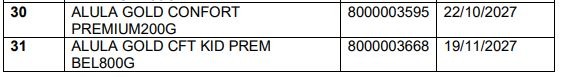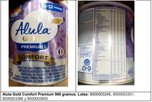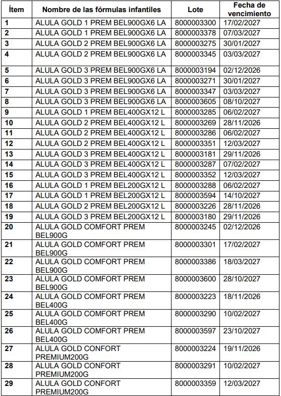 La alerta abarca una amplia gama de presentaciones que incluyen fórmulas de inicio para bebés de 0 a 6 meses, fórmulas de continuación para niños de 6 a 12 meses y alimentos para niños mayores de un año y de corta edad. Entre los lotes afectados se encuentran, por ejemplo, los números 8000003288 y 8000003594 de la presentación Alula Gold 1 de 200 gramos, así como diversos lotes de las versiones Comfort de 400 y 900 gramos. El listado completo de productos comprometidos detalla fechas de vencimiento que se extienden hasta finales de 2026 y gran parte de 2027:
