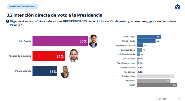 Iván Cepeda se posiciona como el candidato con mayor intención de voto directa, alcanzando un 35%, seguido por Abelardo de la Espriella con un 21% y Paloma Valencia con un 16%. El estudio, que consultó a 1.200 personas en todo el territorio nacional entre el 16 y el 18 de marzo, evidencia una competencia que comienza a decantarse entre sectores de izquierda y derecha, mientras el centro busca terreno con figuras como Sergio Fajardo y Claudia López.