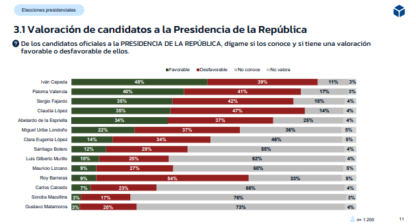La ventaja de Cepeda no solo se manifiesta en la intención de voto espontánea, sino también en su nivel de favorabilidad, donde lidera con un 48%. No obstante, el crecimiento de figuras de la oposición es notable. Paloma Valencia registra un ascenso significativo en los escenarios de segunda vuelta, pasando de un 13% de apoyo en febrero a un 27% en marzo en un eventual enfrentamiento contra Abelardo de la Espriella.