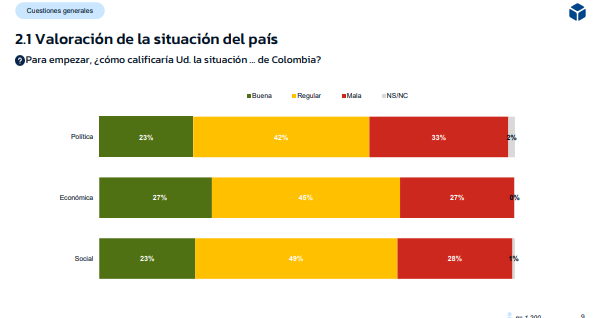 Este clima de opinión refleja una valoración crítica de la situación del país: solo el 23% de los colombianos califica la situación política y social como “buena”, mientras que la percepción de la economía es ligeramente superior, con un 27% de favorabilidad.