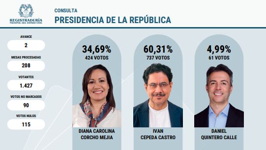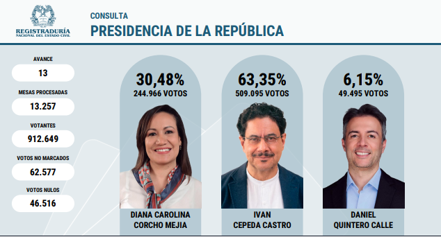 Boletin #10 (6:00pm)Iván Cepeda se convirtió en el ganador de la consulta del Pacto Histórico. Con 858.705 votos (64,12 %) se impuso sobre Carolina Corcho quien logró 398.831 (29,78 %), según el avance número 18 de la Registraduría con 1.529.631 votantes.