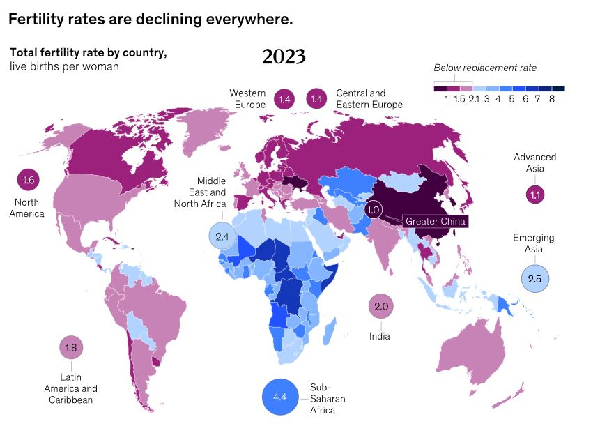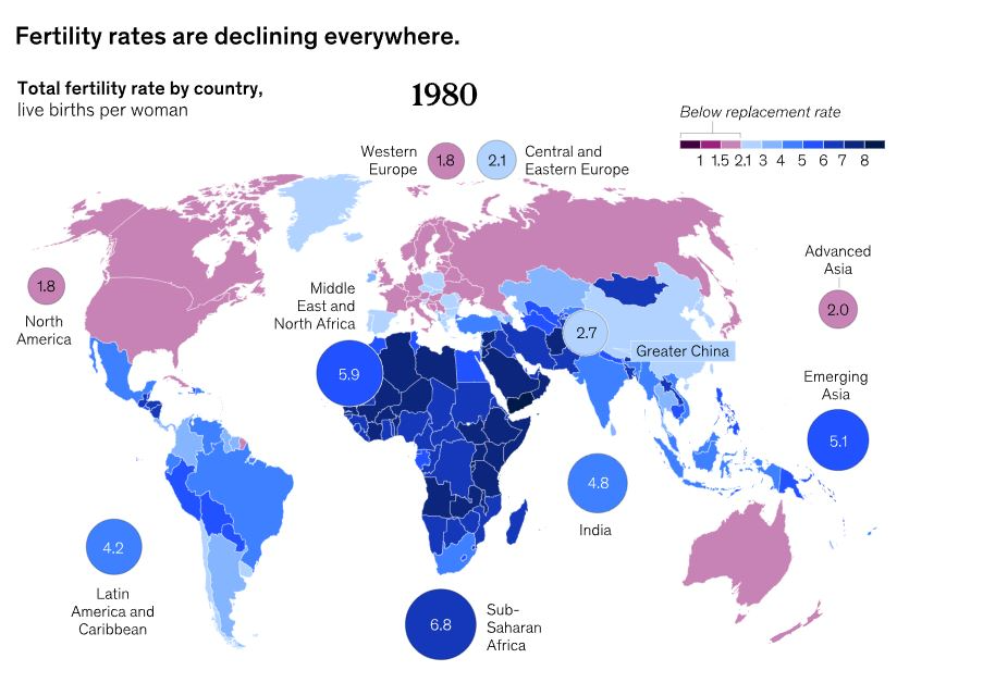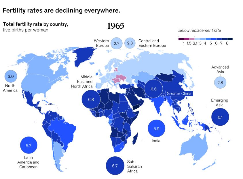 Anu Madgavkar, demógrafa india y socia del McKinsey Global Institute, publicó recientemente su investigación “¿Dependencia y Despoblación? Afrontando las Consecuencias de una Nueva Realidad Demográfica” 1 en la que no solo aborda la caída en las tasas de fertilidad sino cómo ésta está teniendo un impacto en las principales economías del mundo, al no poder respaldar, por ejemplo, los ingresos y las pensiones en 2050.