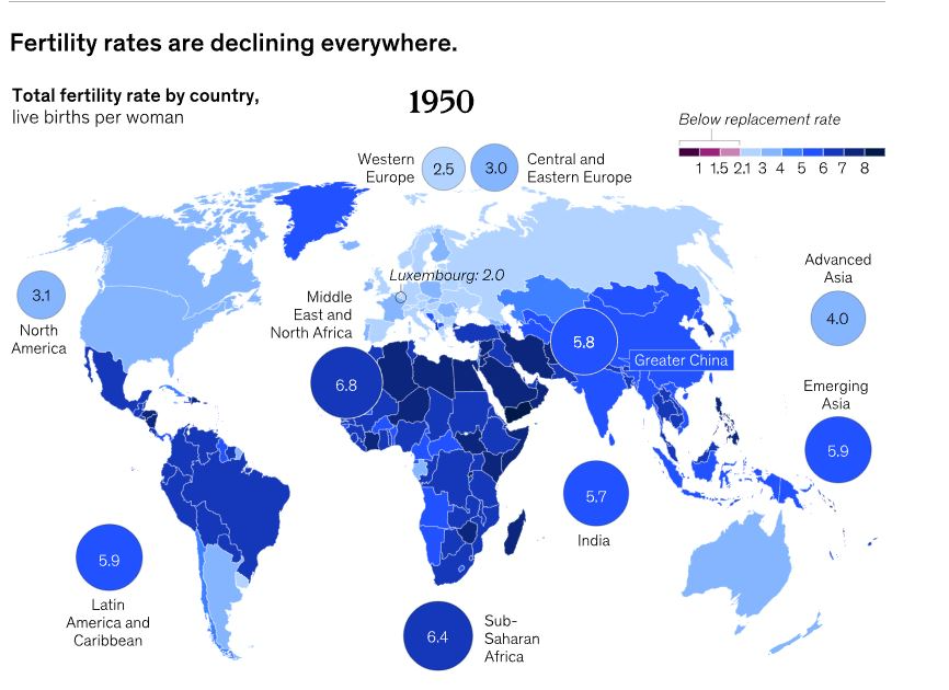 Lo que viene pasando, según esta investigación, es que a partir de la década de los 80, comienza un descenso muy marcado en la medida del número de hijos que tiene una mujer durante toda su vida. Madgavkar, afirma que “durante el último cuarto de siglo, la tasa de fertilidad ha disminuido en el 90 por ciento de los países del mundo”, tal y como lo pueden ver en las siguientes imágenes -donde el color azul cambia radicalmente desde 1950 hasta la actualidad- por lo que ella divide su investigación en 2 grupos: los países que ya están viviendo las consecuencias del cambio demográfico y los que, en unos años, las estarán afrontando. En el primer grupo, están la mayoría de países de Europa y países, como Japón o Corea del Sur. En el segundo, América Latina y países como Bangladesh, Tailandia o Indonesia.