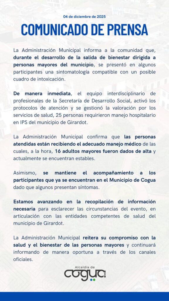 El pasado 4 de diciembre, la Alcaldía de Cogua informó que durante la salida de bienestar dirigida a personas mayores del municipio. “Se presentó en algunos participantes una sintomatología compatible con un posible cuadro de intoxicación”, se lee en el comunicado oficial.