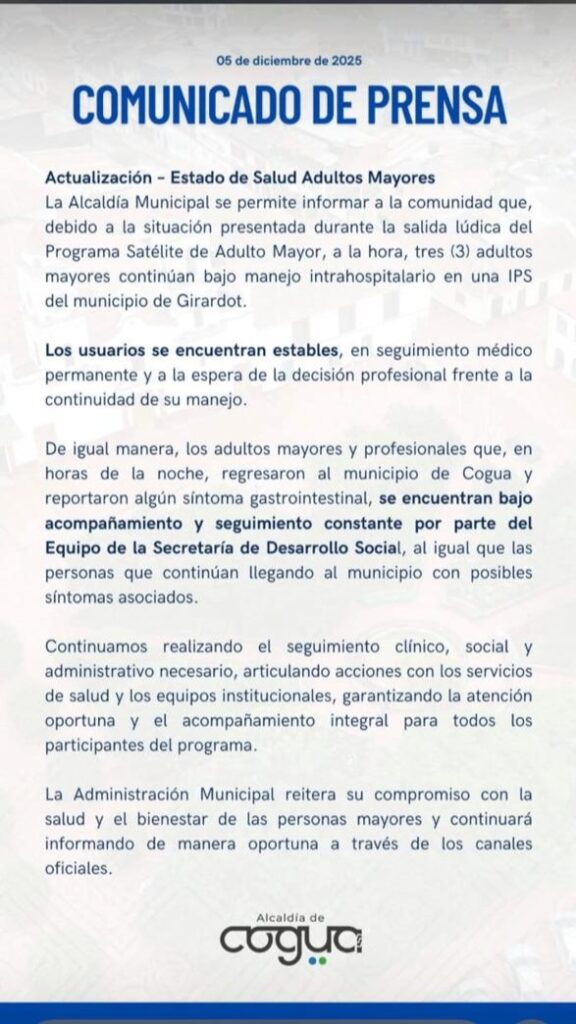 Luego, en un nuevo comunicado de prensa en la mañana del 5 de diciembre, la entidad actualiza la cifra de los adultos mayores que siguen bajo atención médica. “La Alcaldía Municipal se permite informar a la comunidad que, debido a la situación presentada durante la salida lúdica del Programa Satélite de Adulto Mayor, a la hora, tres (3) adultos mayores continúan bajo manejo intrahospitalario en una IPS del municipio de Girardot. Los usuarios se encuentran estables, en seguimiento médico permanente y a la espera de la decisión profesional frente a la continuidad de su manejo”, se lee.