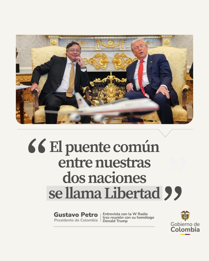 “Aquí ha pasado un pueblo, una historia, pero como nosotros, con conquistas, con esclavitudes, con luchas por la libertad. Y por ahí comencé mi conversación con Trump; el puente común entre nuestras dos naciones, cualesquiera que sean los gobiernos, se llama Libertad”: Presidente Gustavo Petro tras reunión con Trump.