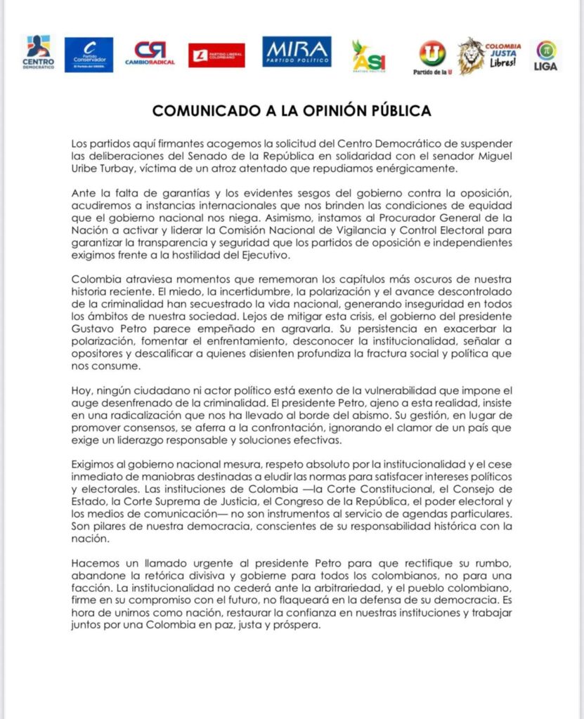 Por su parte, Cepeda expresó ante medios que “por solidaridad a Miguel Uribe Turbay, ante el atroz atentado del que fue víctima, hoy habrá plenaria con el uso de la palabra exclusivo al Centro democrático y luego se levantará la sesión”
