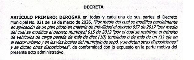 La Alcaldía Municipal de Sopó, bajo la administración de Alba Fabiola Muñoz Rodríguez, oficializó el pasado 17 de abril a través del Decreto 035 de 2026 el restablecimiento de las medidas restrictivas para el tránsito de vehículos de carga pesada en el casco urbano y las vías locales. La decisión deroga el anterior Decreto 021 de 2026, el cual había modificado temporalmente las normas de circulación para aplicar un plan piloto de movilidad. Con esta nueva disposición, el municipio retorna a la regulación establecida originalmente, buscando priorizar la seguridad vial y la conservación de la malla vial urbana que se veía comprometida por el flujo constante de grandes automotores.