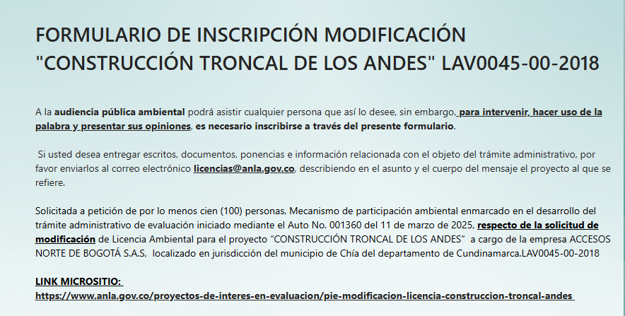 Por su parte, la Audiencia Pública Ambiental se realizará el domingo 30 de noviembre de 2025, a partir de las 8:00 a.m, en el Auditorio Álvaro del Portillo de la Universidad de La Sabana, ubicada en el kilómetro 7 de la Autopista Norte de Bogotá, en jurisdicción del municipio de Chía.