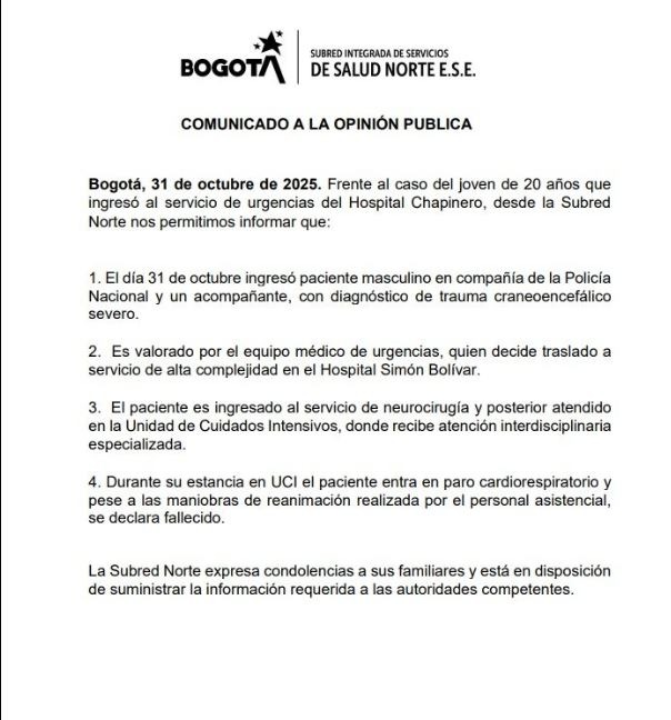 El joven fue trasladado inicialmente al Hospital Chapinero, donde ingresó acompañado por la Policía y un familiar. Según reportó la Subred Norte de Bogotá, el paciente presentaba un trauma craneoencefálico severo, por lo que fue remitido al Hospital Simón Bolívar. Allí ingresó al servicio de neurocirugía y posteriormente a la Unidad de Cuidados Intensivos (UCI), donde recibió atención especializada.