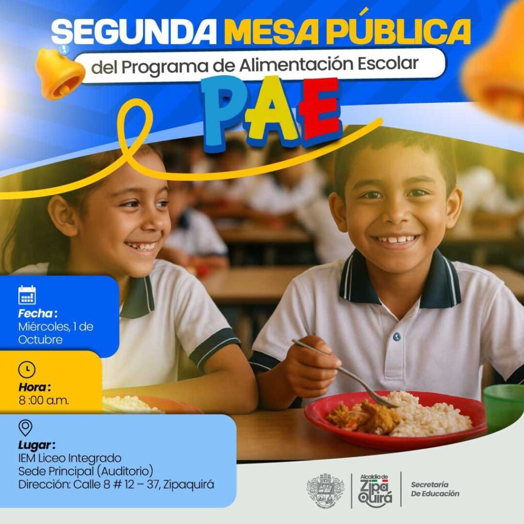 El próximo miércoles 1 de octubre, a las 8:00 de la mañana, la Secretaría de Educación de Zipaquirá llevará a cabo la segunda Mesa Pública del Programa de Alimentación Escolar (PAE) en la sede principal de la Institución Educativa Liceo Integrado.